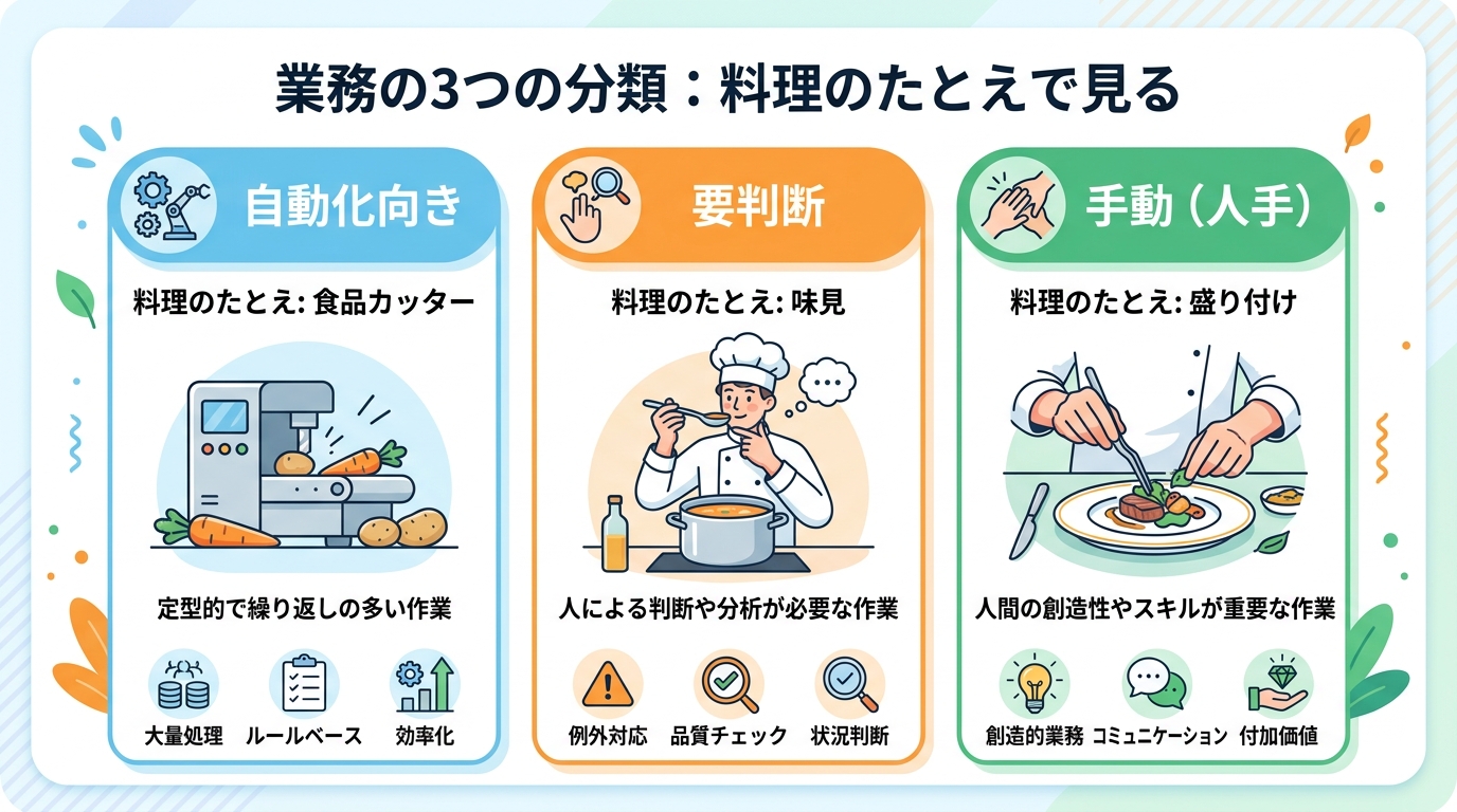 自動化候補の業務負荷を特定する 毎日のお仕事のなかで、「これ、なんだか同じことの繰り返しだな」と感じたことはありませんか? たとえば 料理 を考えてみましょう。毎回野菜を切って、鍋に入れて、味を調える——このなかで...