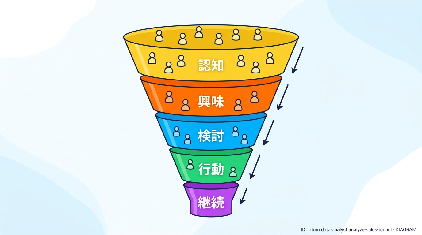 あなたのお店やサービスで、「商品を知ったのに買わなかった人」はいませんか? この Atom では、売上が生まれるまでの道のりを「ファネル(=漏斗のように上が広く下が狭い形)」として分解し、どこでお客さんが離れているのかを AI と一緒に見つけ出します。