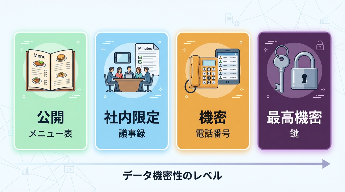 データの機密度を見極める 会社で扱うデータには、「誰が見ても問題ないもの」と「見る人を間違えると大トラブルになるもの」がありますよね。 たとえば、料理のレシピは誰に見せても安心ですが、冷蔵庫に貼ってある「私の健康診...
