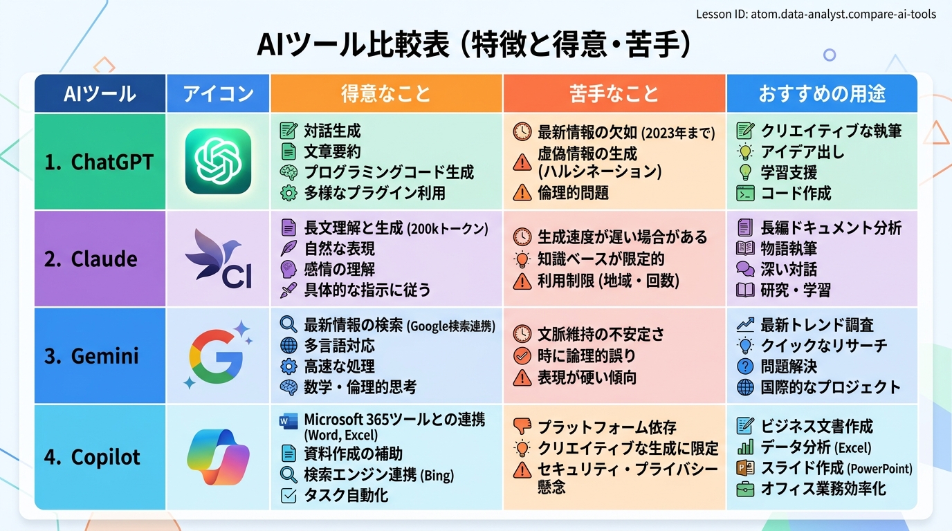 分析に使うAIツールを使い分ける 料理をするとき、スープを混ぜるのに包丁は使いませんよね。用途に合わせて「泡立て器」「フライパン」「お玉」を使い分けるように、AIツールにもそれぞれ得意・不得意があります。 このレッ...