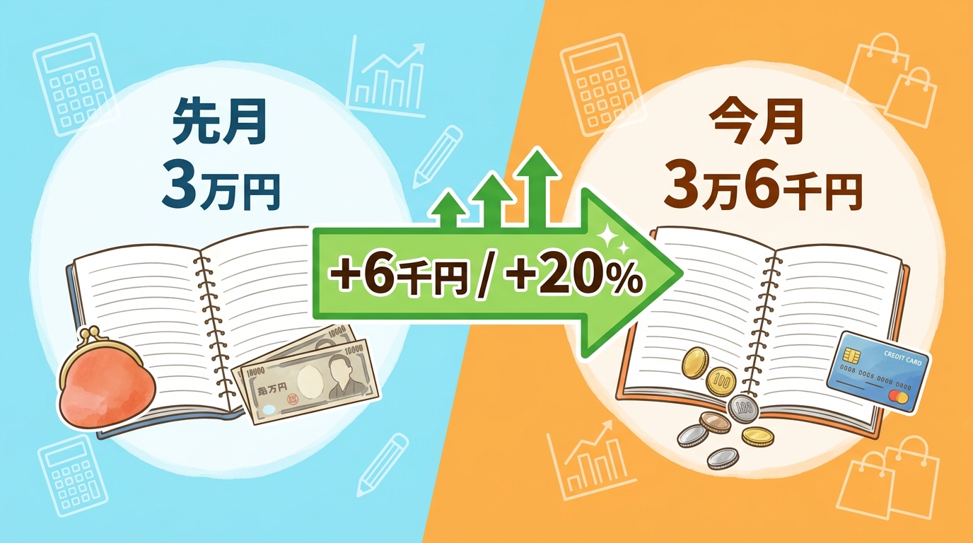 たとえば家計簿をイメージしてみましょう。先月の食費が3万円で、今月が3万6,000円だったとします。「6,000円増えた」「20%増えた」というふうに、違いを金額と**割合(%)**の両方で表すのがポイントです。