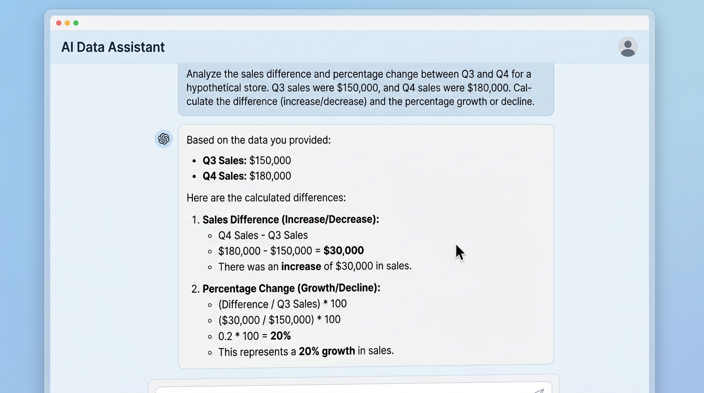 良い結果の例: 「売上は前月比 +30,000円(+20%)の増加です」 → 金額も%も方向も揃っていて、すぐ判断できます。