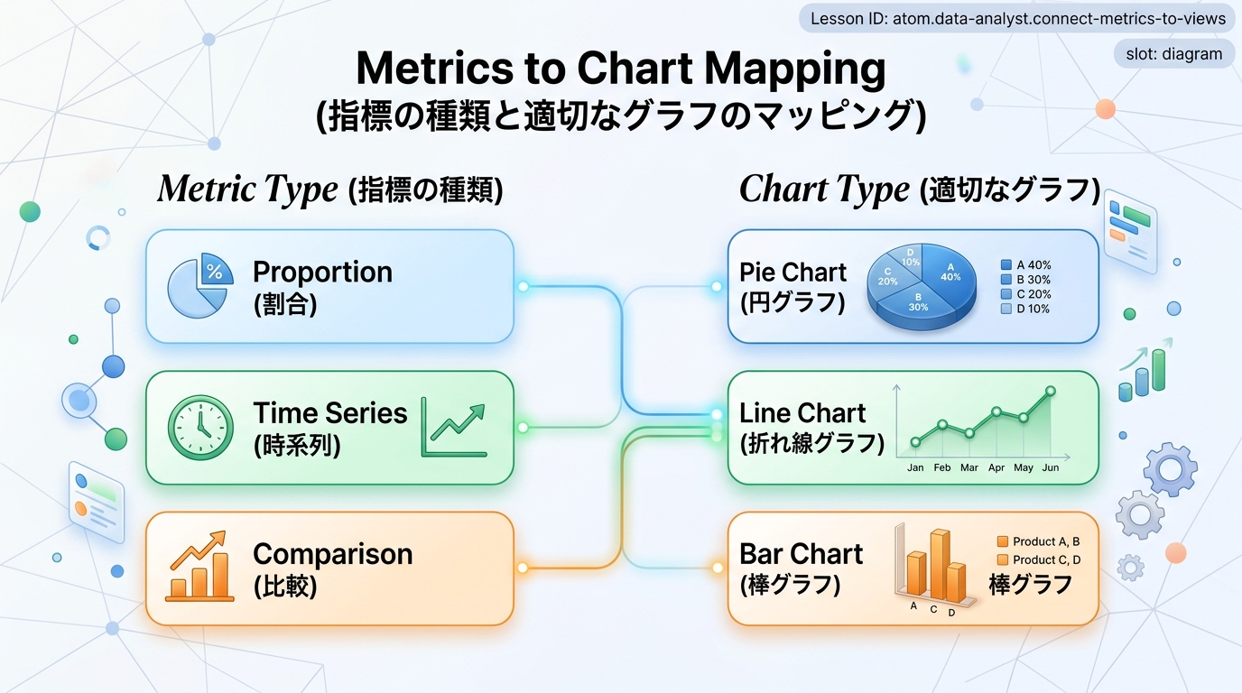 指標と表示を結び付ける データをただの数字の羅列から、パッと見てわかる「グラフ」に変える作業は、料理に例えられます。 せっかく美味しいシチュー(=指標のデータ)を作っても、お皿(=グラフの種類)を選び間違えると、こ...