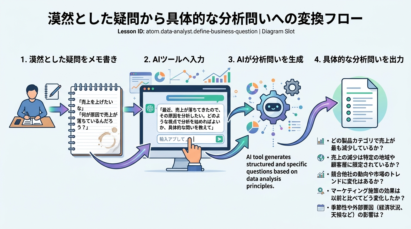 このレッスンでは、AIツール(ChatGPTやClaudeなどの対話型AI)を味方につけて、あなたの業務のモヤモヤを「データで答えられる分析問い」に変える方法を学びます。15分で、しっかり使える分析問いを1つ完成させましょう。