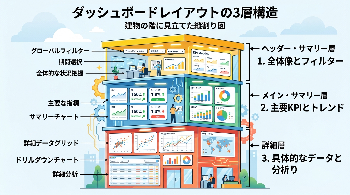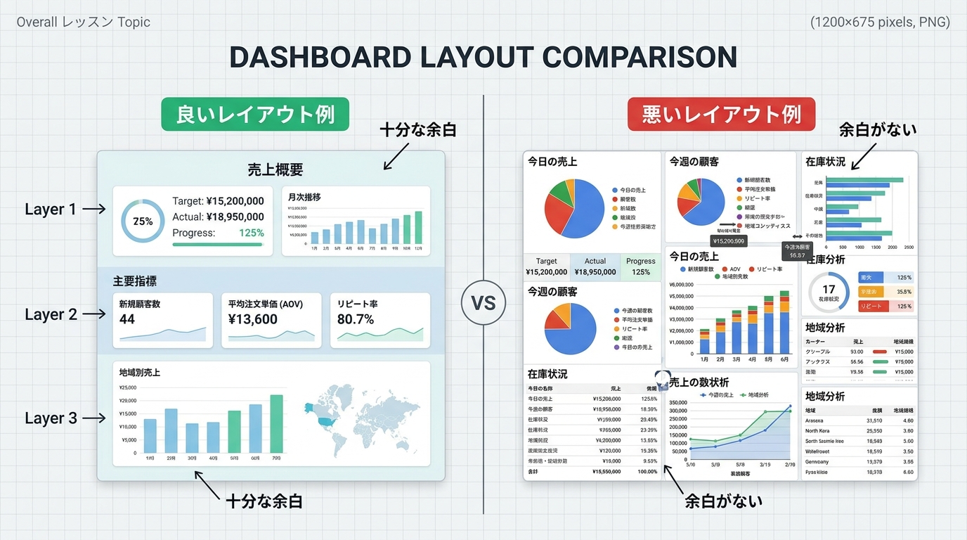 データの画面(ダッシュボード=情報をひとまとめに見せる画面)も同じです。数字が散らばっていると読む人が困ります。このレッスンでは、AIツールを味方につけて、情報を整理した見やすい画面構成を設計する方法を学びます。