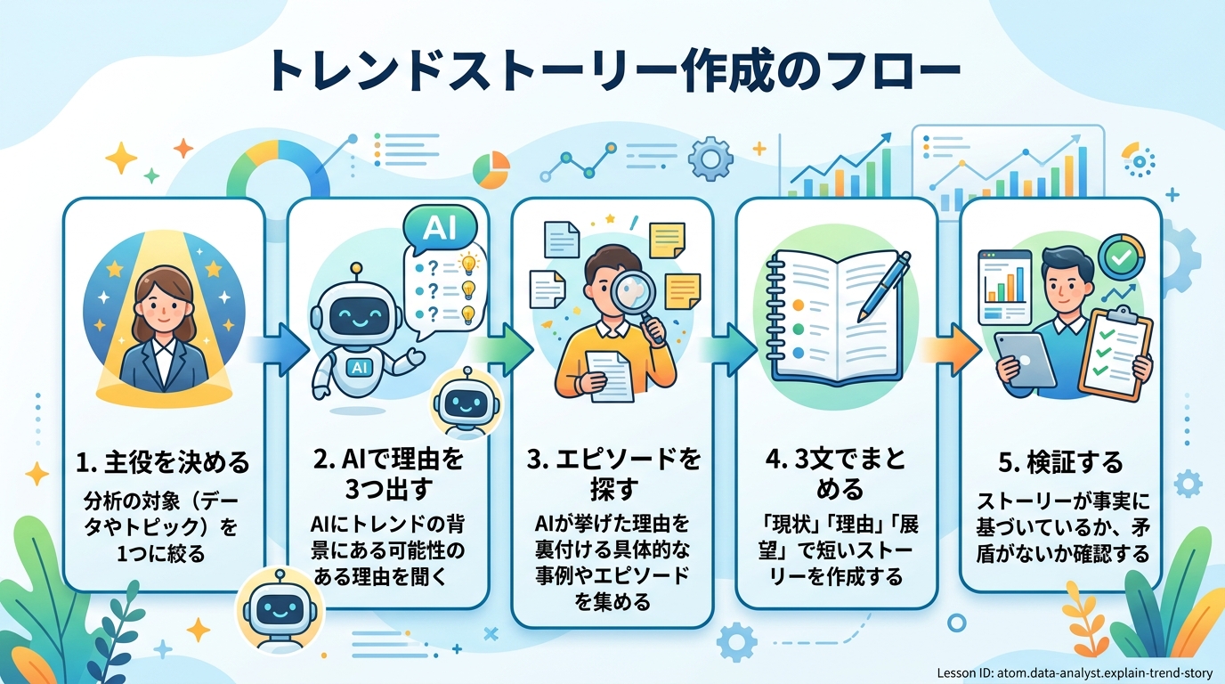 このレッスンでは、AIチャットツール(ChatGPTやClaudeなど)を使って、データのトレンドに分かりやすい筋書きをつける方法を15分で身につけます。完了すると、「トレンドを3文で説明するドキュメント」という成果物が手元に残ります。