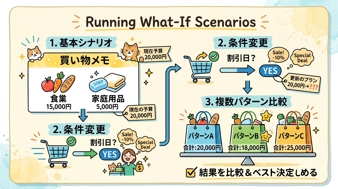 たとえるなら、料理のレシピで「砂糖を半分にしたらどうなる?」「オーブンの温度を10度上げたら?」と条件を変えて試すのと同じです。AIを使えば、こうした試算を一瞬で何パターンも作れます。