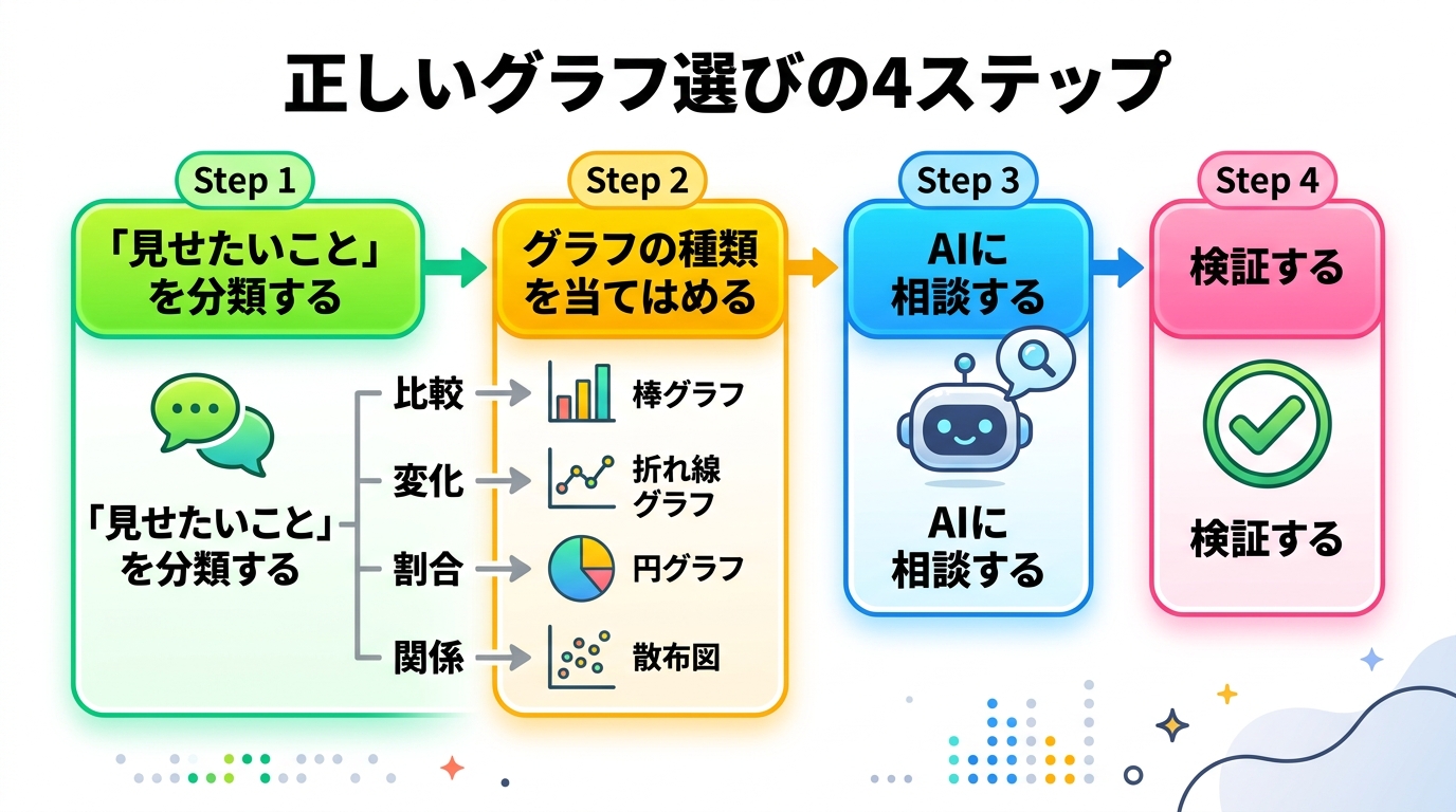 AI の回答をもらったら、以下の3つの観点で確認してください。すべて「はい」なら、グラフ選びは成功です。