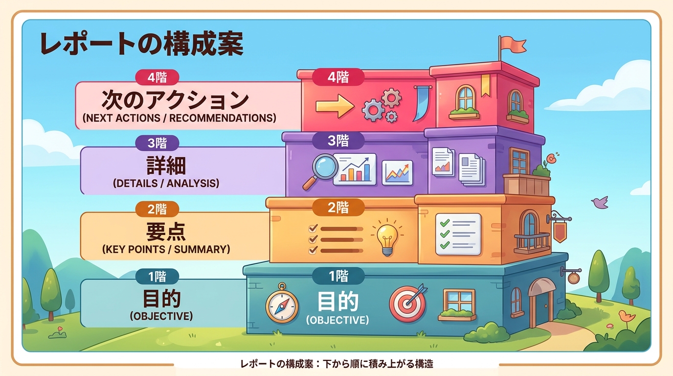 伝わるレポート構成を作る 上司やチームにデータの結果を伝えるとき、「なんだか長くて読みにくい…」と言われたことはありませんか? レポートは 旅行のポストカード に似ています。届いた人がパッと見て「どこに行って、どう...