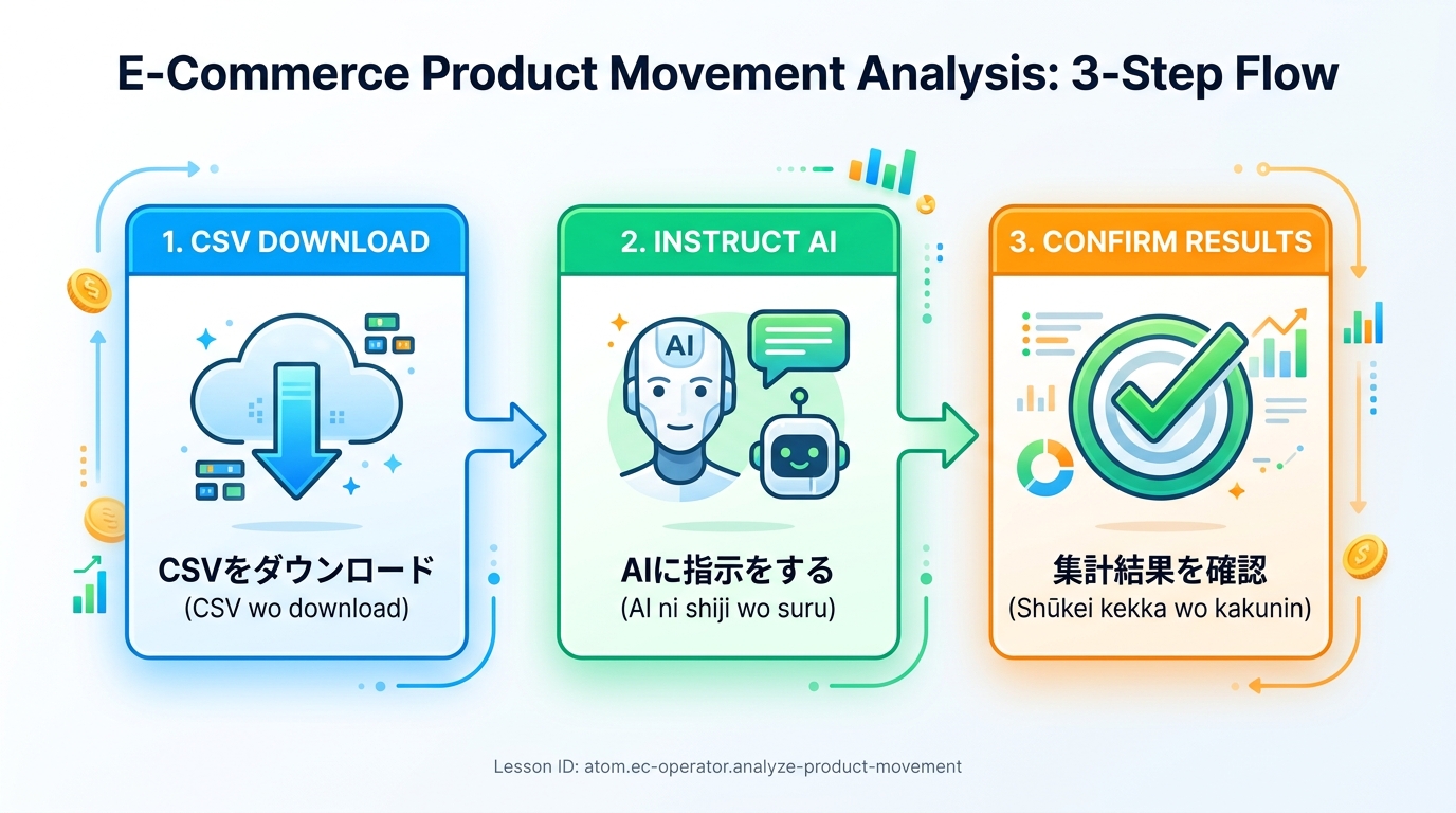 AIで商品別の動きを把握する あなたのネットショップで、「どの商品がよく売れているか」「どの商品が棚に残ったままか」——これをひと目で分かるレポートにまとめましょう。AI(=人工知能を使ったチャットツール。Chat...