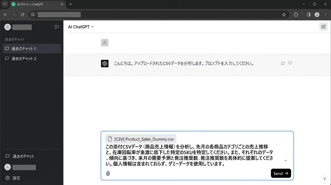 AIのチャット画面で、CSVファイルをドラッグ&ドロップ(またはクリップのアイコンから選択)して添付し、上のプロンプトと一緒に送信します。