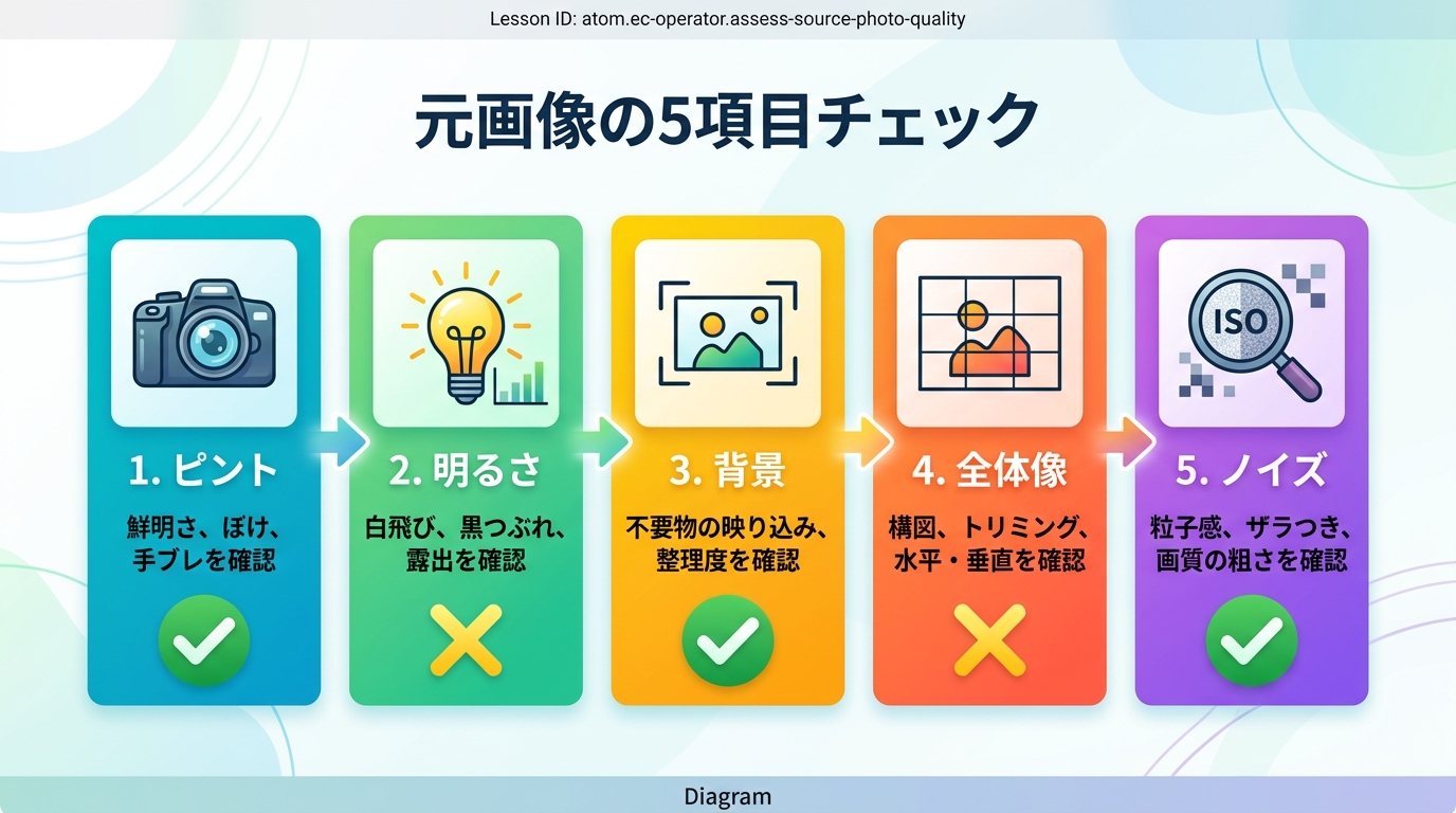 このレッスンでは、あなたが手元の商品写真を「AIに任せて大丈夫か」自分で判断できるようになることを目指します。所要時間は約15分です。