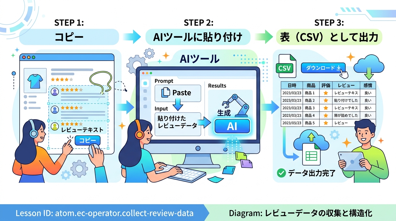 ポイント: 完璧に整形する必要はありません。星の数やユーザー名が混ざっていても、AIが読み取ってくれます。