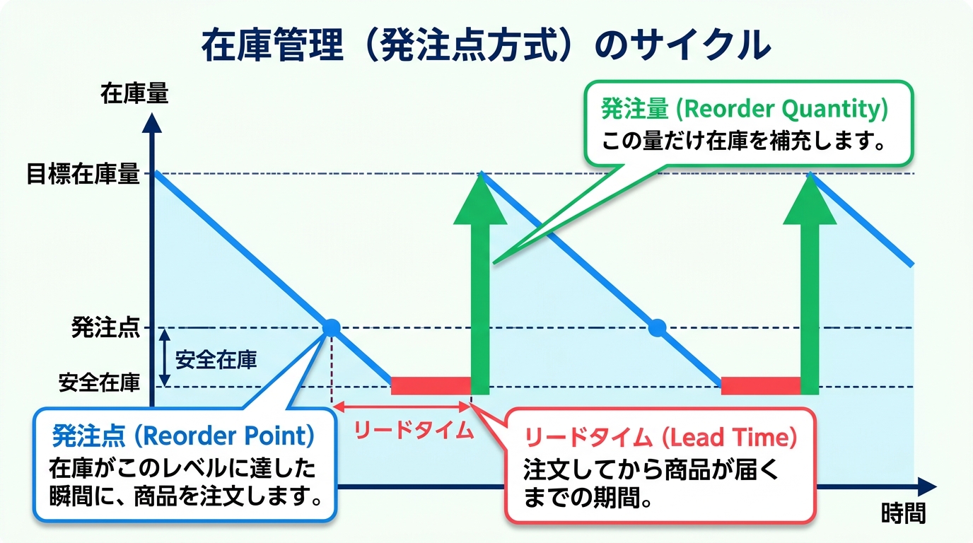 | 発注点 | この在庫数を下回ったら注文するライン | 牛乳が1本になったら買いに行く |