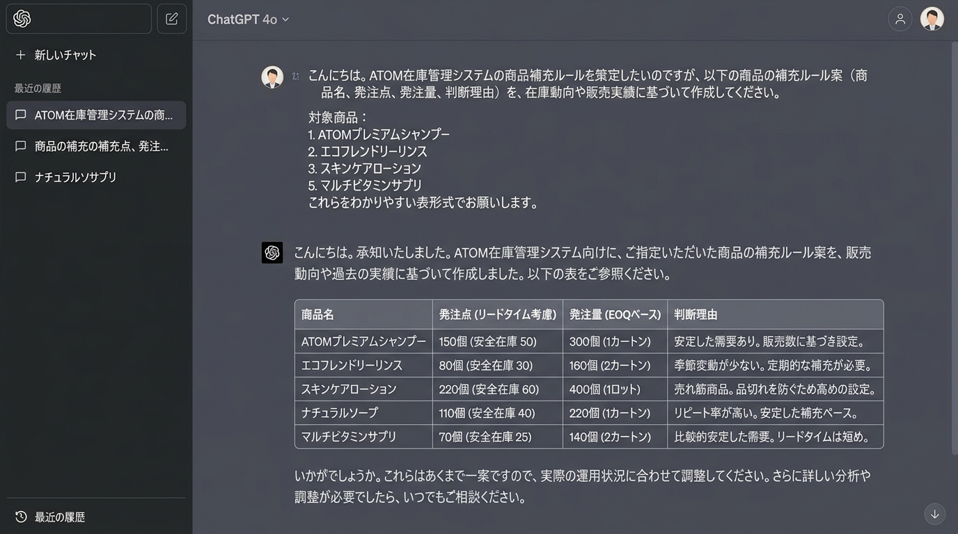 - 「季節で売れ行きが変わる」 → 繁忙期(=売上がぐっと上がる時期)は発注点を1.5倍にした「繁忙期ルール」を別に作りましょう。AIに「12月は通常の1.5倍売れる想定でルールを再計算して」とお願いできます