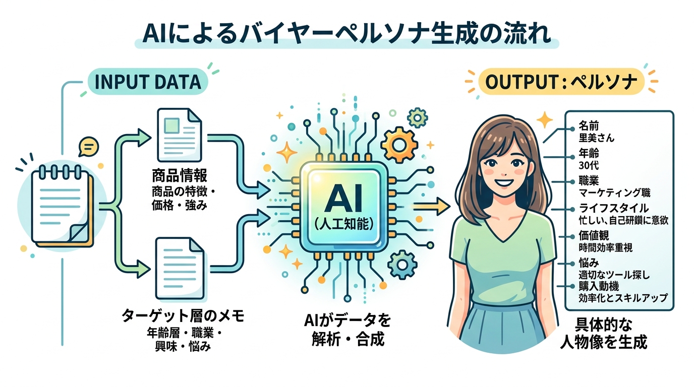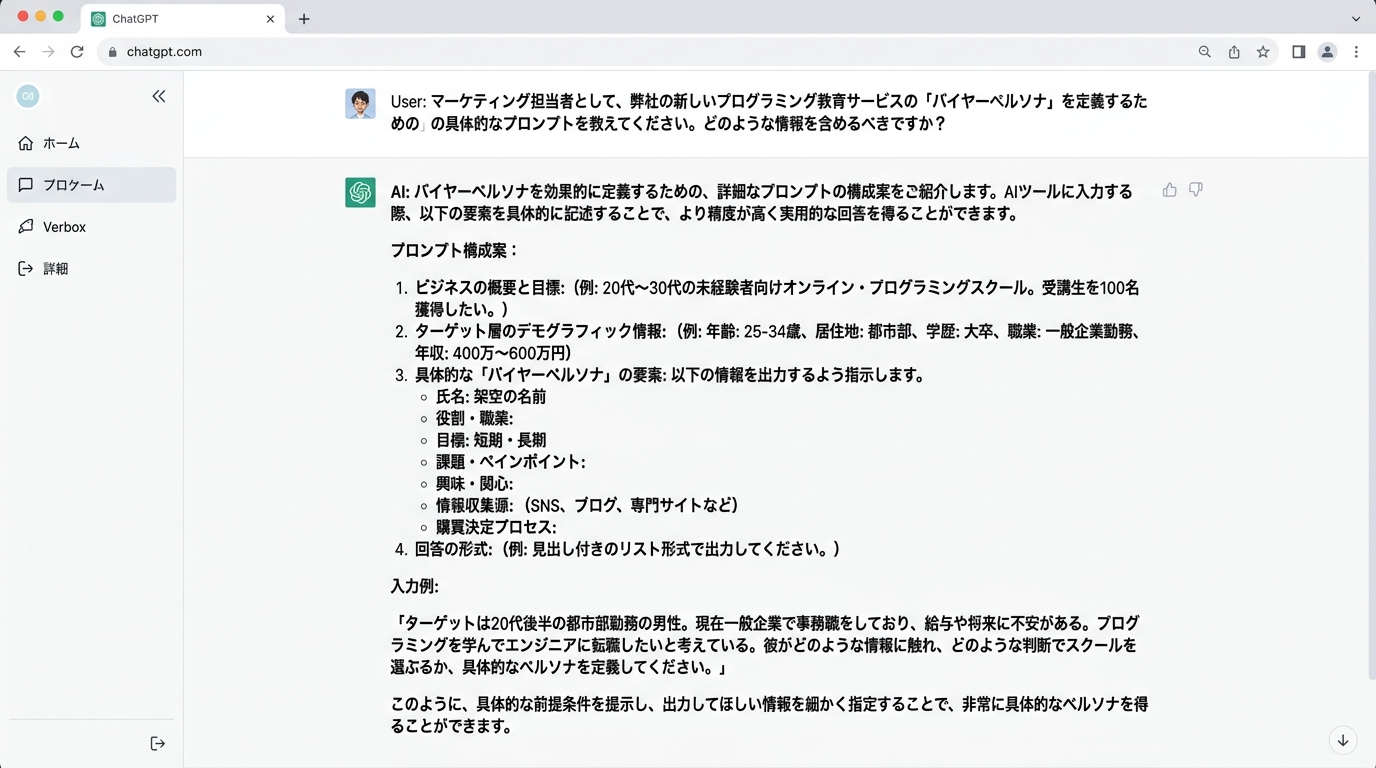 | 何度やっても「ぼんやりした人物像」しか出ない | 「名前・年齢・職業・住所・趣味・SNS・購入きっかけを全て含めて」と項目を指定し直す |