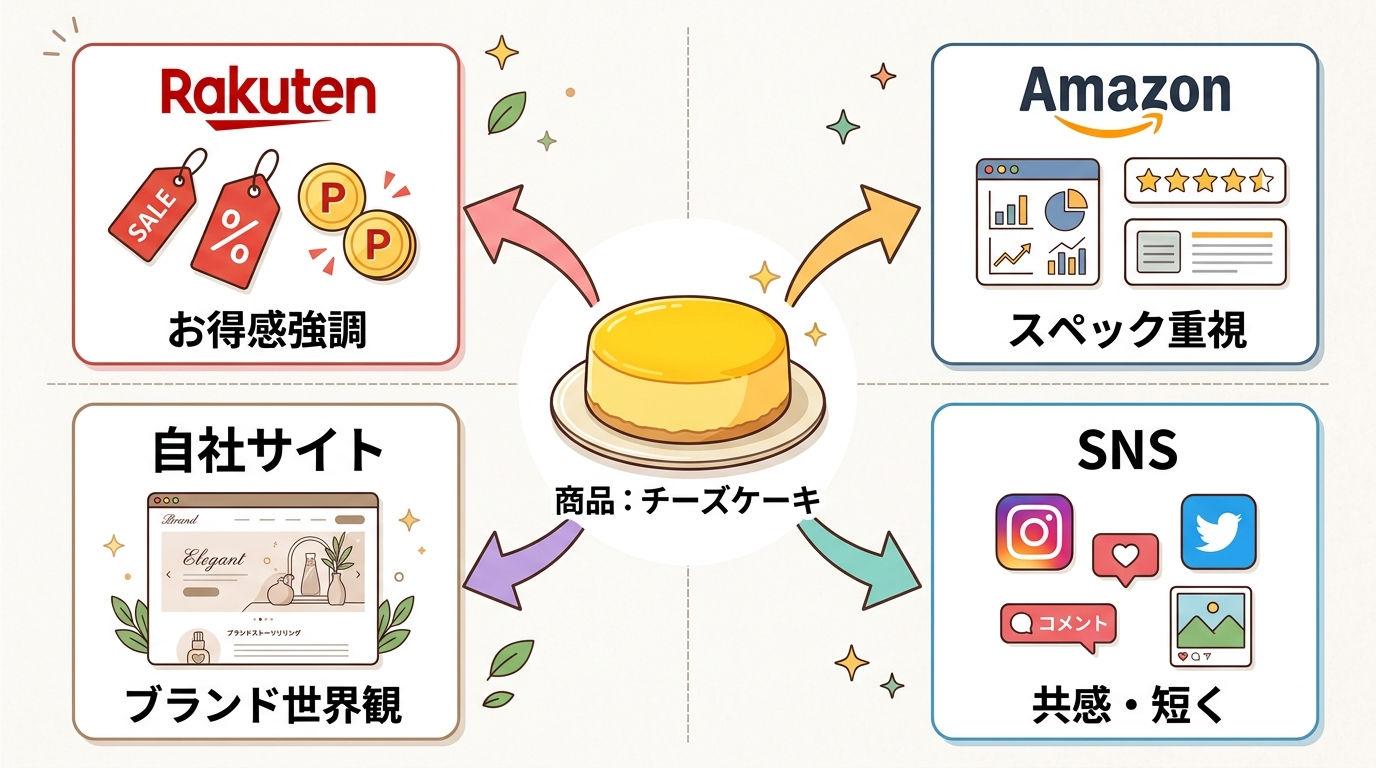 ECサイト(=ネットショップ)でも同じです。楽天市場、Amazon、自分のサイト、Instagram——それぞれの「聞き手」に合わせて商品の説明文を変えると、ぐっと売れやすくなります。