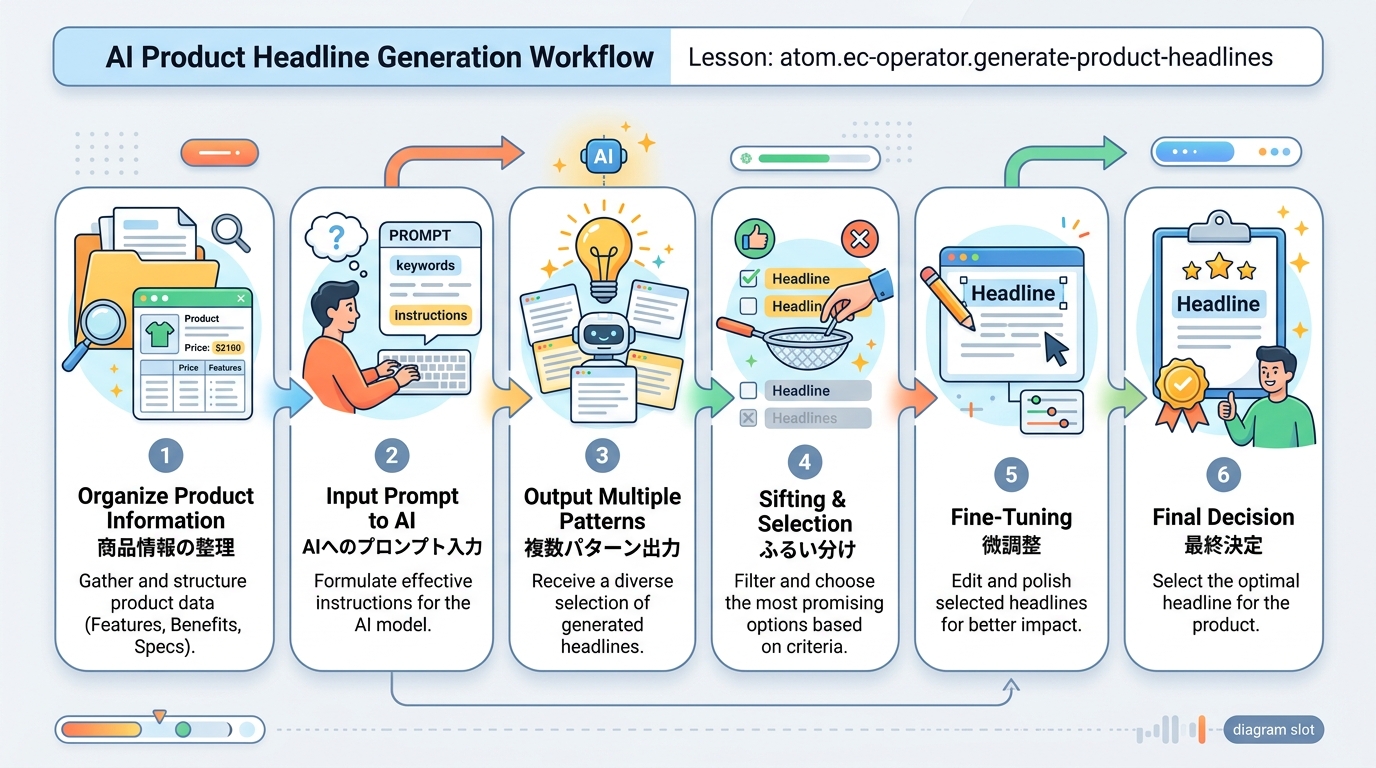 商品名と見出しを生成する レストランのメニューを想像してみてください。同じポテトフライでも、「カリカリ香ばしい 手切りポテトフライ」と書いてあれば、思わず注文したくなりますよね。ECサイト(=ネットショップ)の商品...