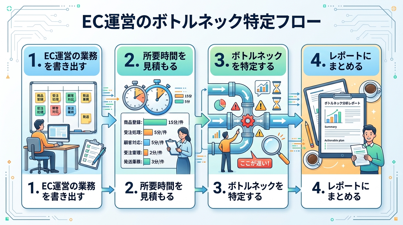 ボトルネック業務を特定する あなたのECサイト運営、なんだか「ここが遅いな」「ここばかりに時間を取られるな」と感じたことはありませんか? 料理で例えてみましょう。カレーを作るとき、野菜を切るのは5分、ご飯を炊くのは...