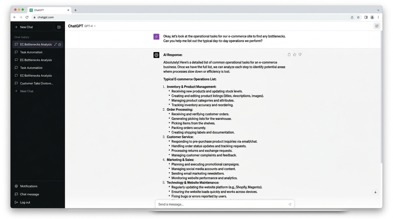 まずは、あなたのEC運営でやっている業務をすべて書き出しましょう。自分だけで思い出すのは大変なので、**AIに「聞き出してもらう」**とラクです。