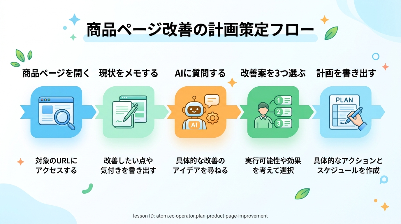 このレッスンでは、AIチャットツール(=人工知能を使った対話型の便利ツール)を相棒にして、15分で商品ページの改善計画を立てます。「何を」「なぜ」「どうやって」直すかを書き出した計画書が、あなたの成果物です。