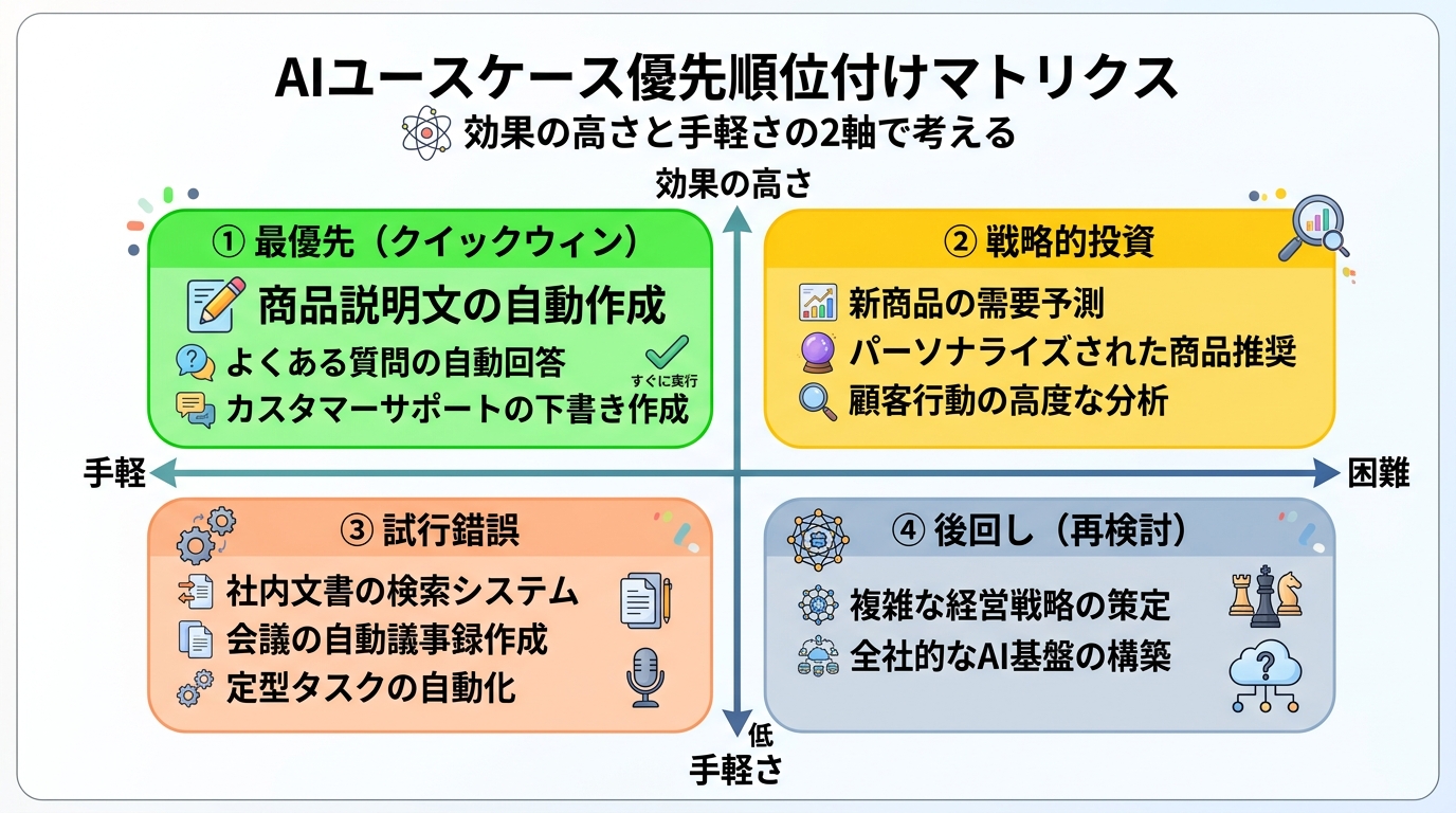 忙しい平日の夜、夕食を作る場面を想像してみてください。時間と体力は限られています。冷蔵庫にある食材のなかから、「一番手軽で、しかもおいしいもの」を選びますよね。AIの導入もこれと同じです。限られた時間のなかで、一番効果が高くて導入がラクなものから始めるのがコツです。