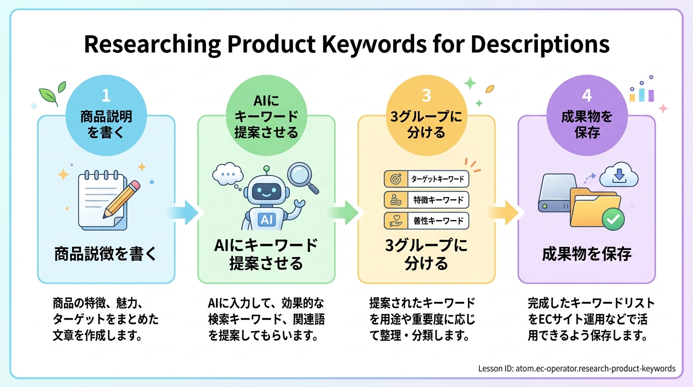 このレッスンでは、AIツール(=人工知能を使った便利ツール。ChatGPTやClaudeなど)に手伝ってもらいながら、あなたの商品にぴったりの検索キーワードをリストアップします。所要時間は約15分です。