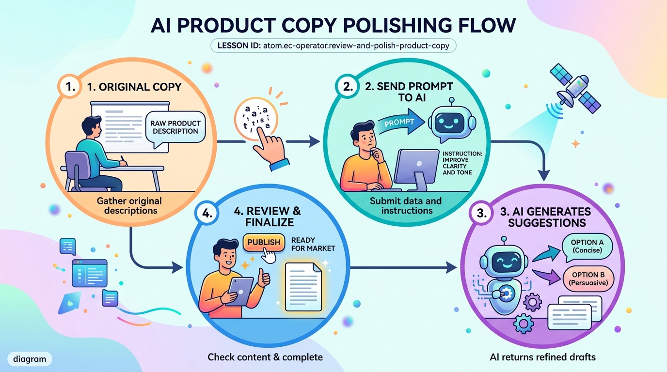 このレッスンでは、AIツール(=人工知能を使った便利なWebサービス。例:ChatGPT、Claude)を活用して、商品の説明文をぐっと魅力的にする方法を学びます。所要時間はおよそ15分です。