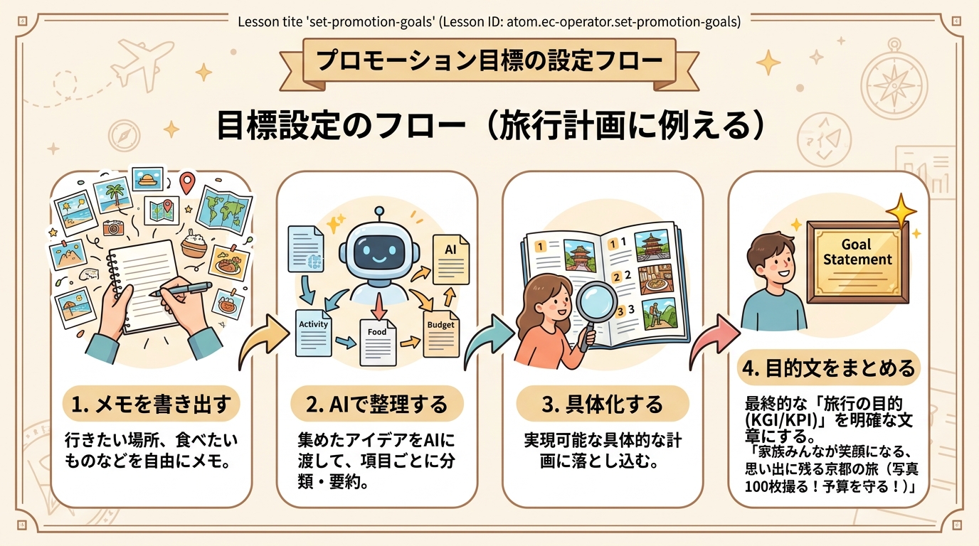 このレッスンでは、AIチャット(ChatGPTやClaude)に相談しながら、あなたのショップに合ったプロモーションの目的を1つ決めて、メモにまとめるところまでを15分で体験します。