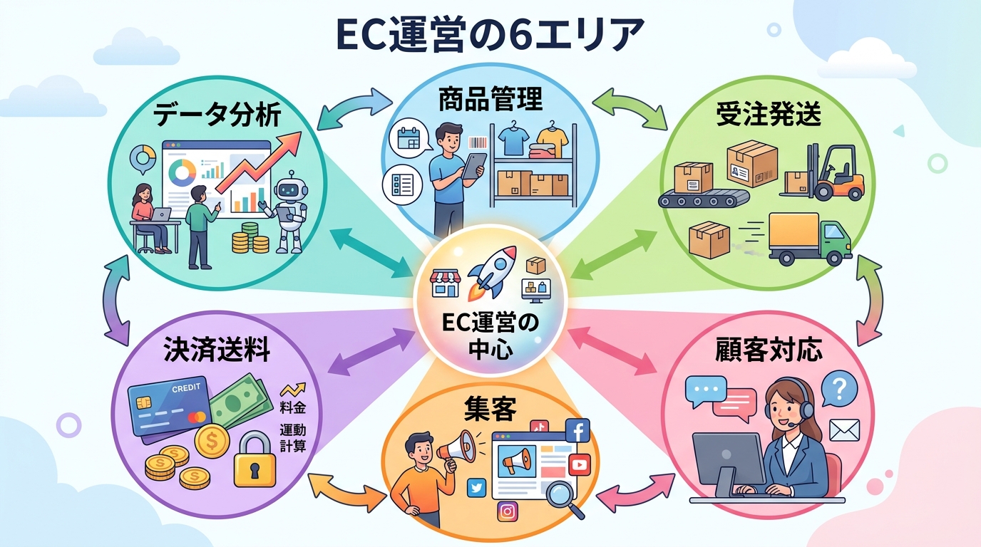 EC運営の6つのエリア(商品管理、受注・発送、顧客対応、集客、決済・送料、データ分析)について、