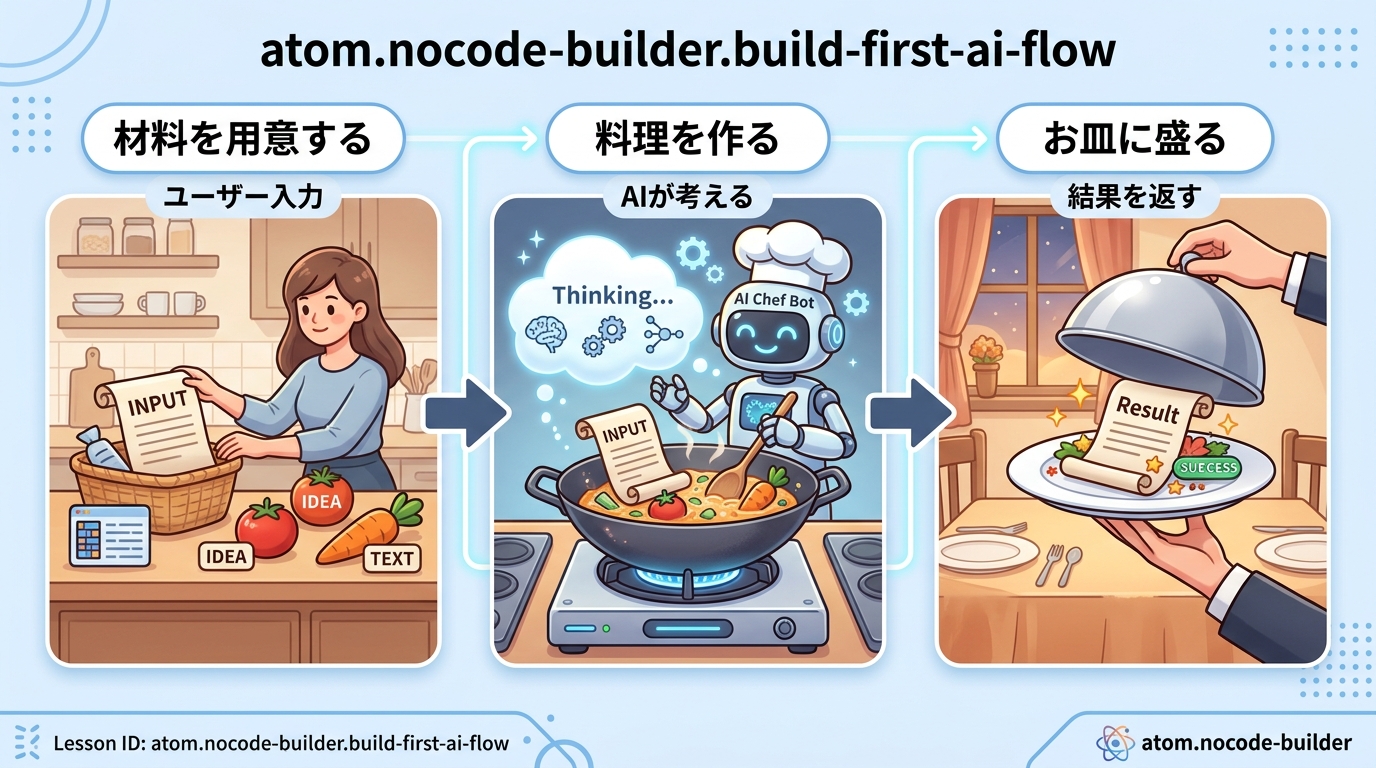 料理で考えてみましょう。レシピには「材料を切る → 煮込む → 味を調える」という流れがありますよね。AIフロー(=AIが行う作業の流れ)もこれと同じです。「あなたが言葉を入力する → AIが考える → 結果が返ってくる」。この一連の流れを、プログラミングなしで組み立てるのが今回の目標です。