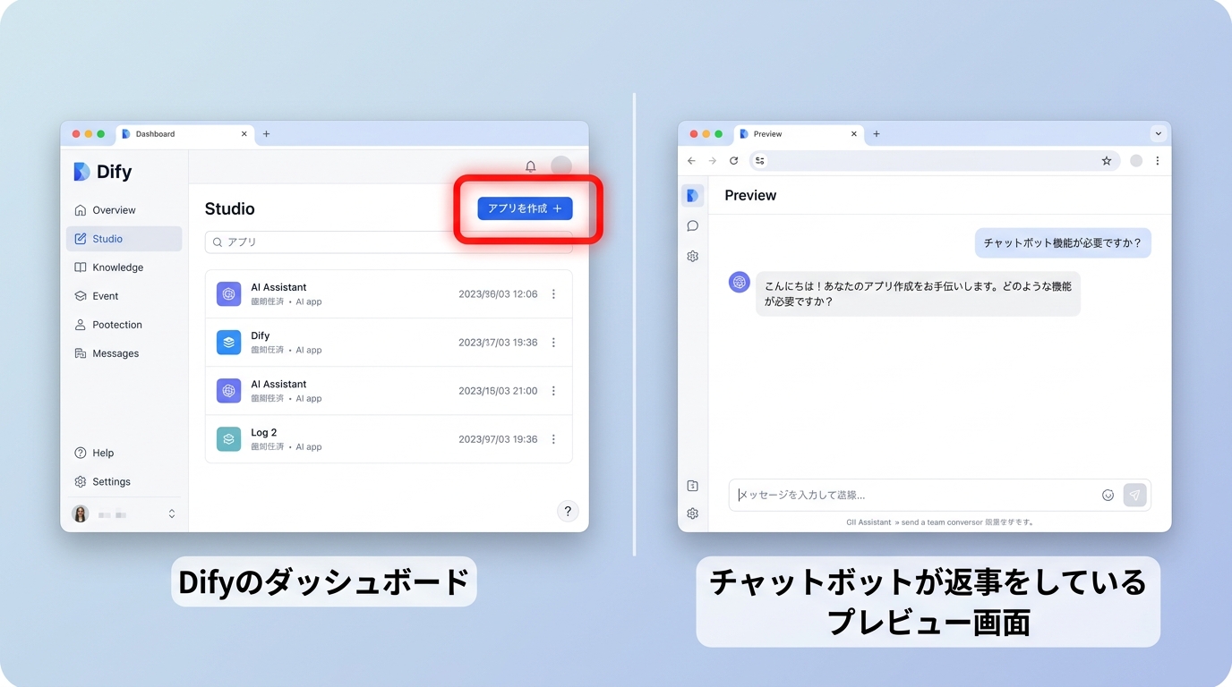 このレッスンでは、Dify(ディファイ=ブラウザ上でAIアプリを作れる無料サービス)を使って、あなた自身の手で最初のAIチャットボット(=自動で会話してくれるしくみ)を作ります。所要時間はおよそ15分です。