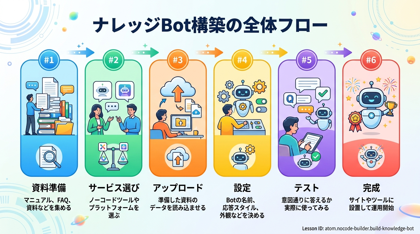 この Atom では、あなたの手元にある資料(社内マニュアル、FAQ、手順書など)を AI に読み込ませて、質問すると的確に答えてくれる「ナレッジボット」を作ります。プログラミングの知識は不要です。ChatGPT を使って、15分以内に動くボットを完成させましょう。