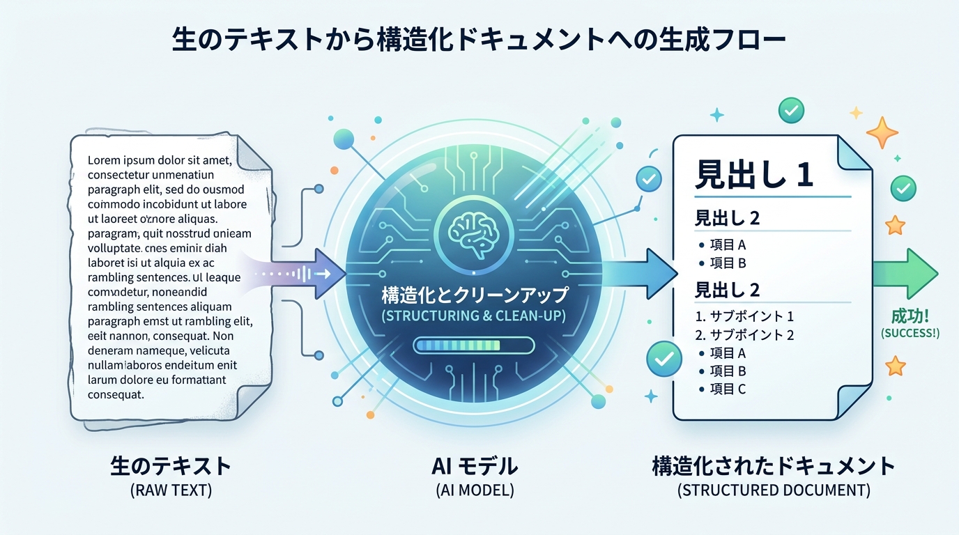 あなたが持っているメモや資料のテキストを、AI に渡して、見やすい形に変身させます。 流れはとてもシンプルです。