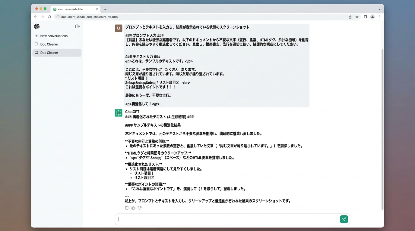 ChatGPT(https://chat.openai.com)や Claude(https://claude.ai)など、お好きな AI チャットツールを開きます。 用意したテキストを貼り付けたら、その前に プロンプト(= AI への指示文) を書いて送信します。