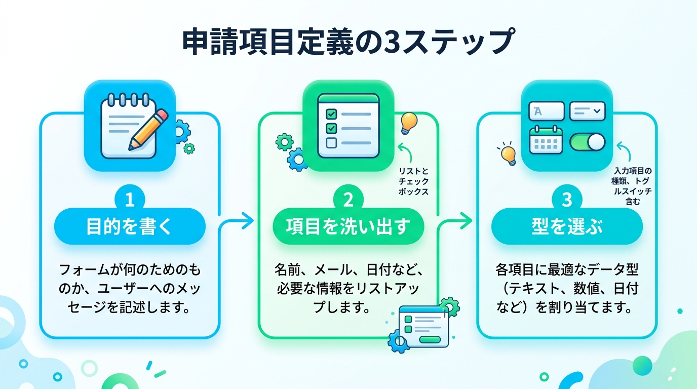 申請項目の定義も同じです。申請フォームという「招待状」に、何を書いてもらう欄を作るかを決める作業です。