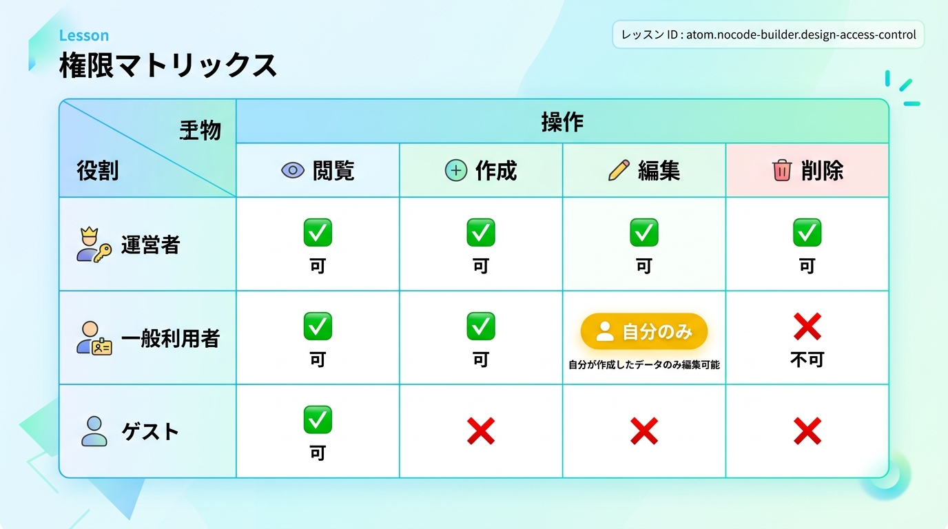 あなたのアプリでも同じ仕組みが必要です。管理画面は誰でも見られるべきではありませんし、顧客データは担当者だけが編集できるようにしたいですよね。このレッスンでは、AIツールの力を借りながら、あなたのアプリに合った「誰が何をできるか」の設計書を15分で仕上げます。