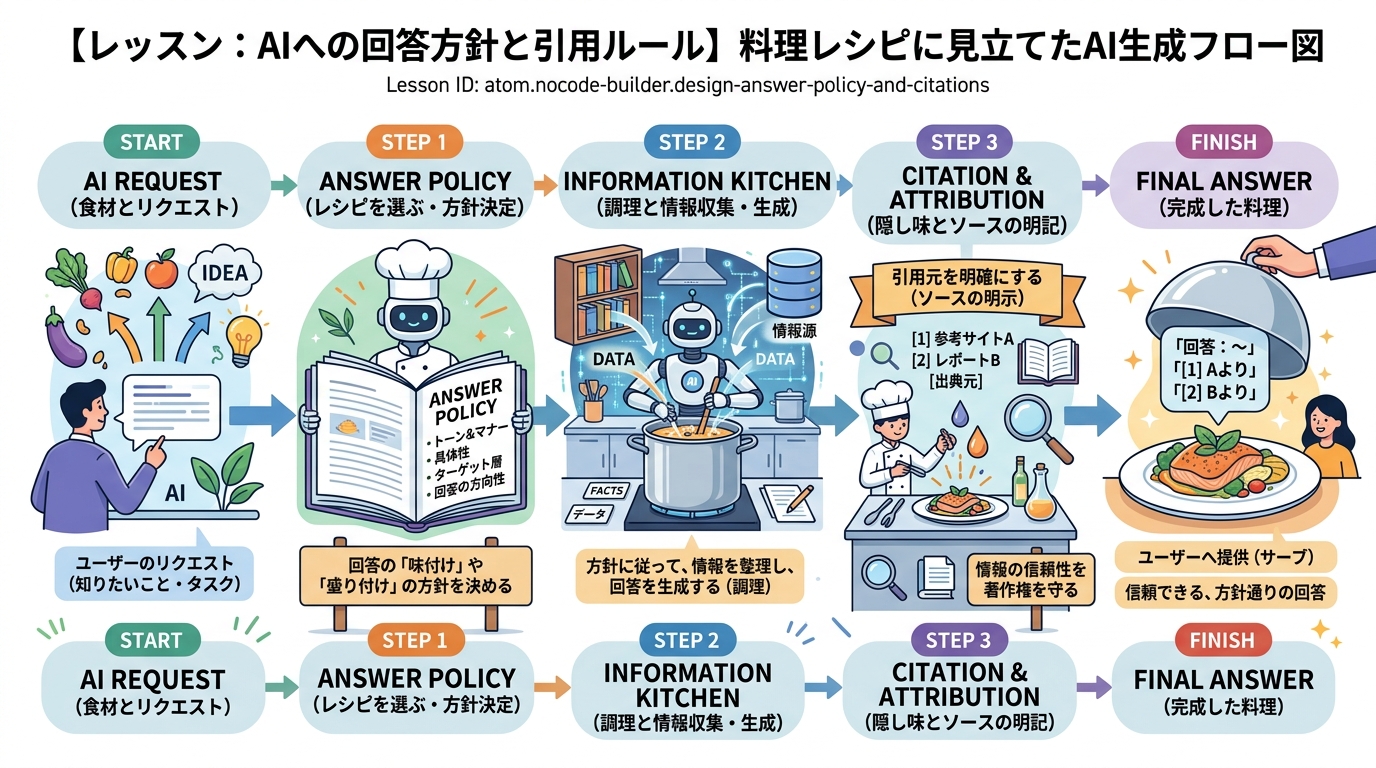回答方針と引用表示を設計する AI(人工知能)に社内の質問を答えてもらうとき、「なんだか機械的でピンとこない」「この情報、本当に正しいの?」と感じたことはありませんか? ここは料理に似ています。美味しい料理を作るに...