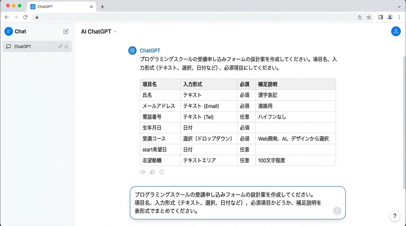 ここからが本番です。AIツール(ChatGPT、Claude、Cursorなど)を使って、あなた専用のフォーム設計案を作りましょう。