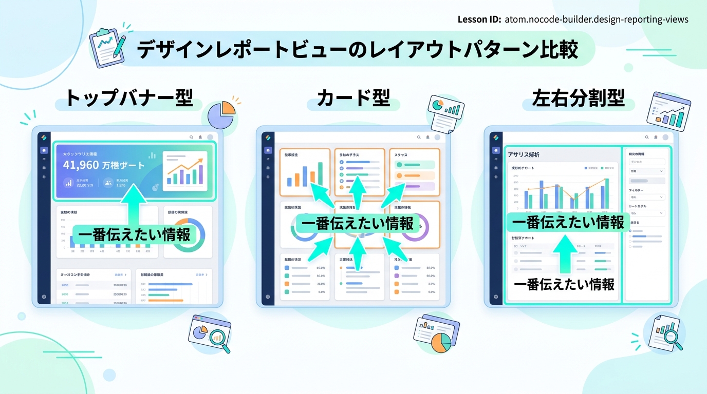 | 「レイアウトのパターンを選べない」 | 迷ったらトップバナー型から始めましょう。一番シンプルで、多くのレポートに使えます |