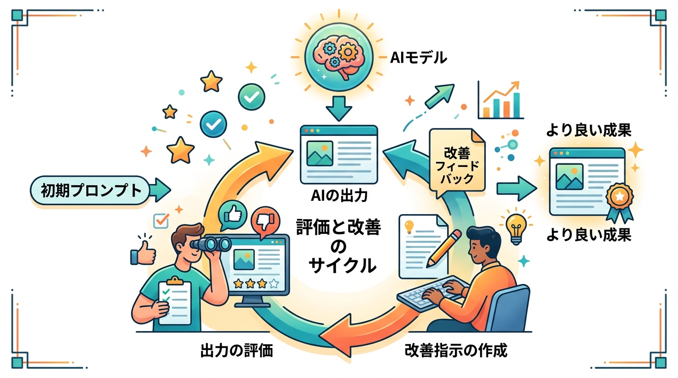 ここで大切なのは、あなたが「味見(=評価)」をし、「もう少し塩を減らして」「盛り付けを変えて」と伝えること(=改善指示)です。このサイクルを繰り返すことで、AIの出力はどんどんあなたの望む形に近づきます。