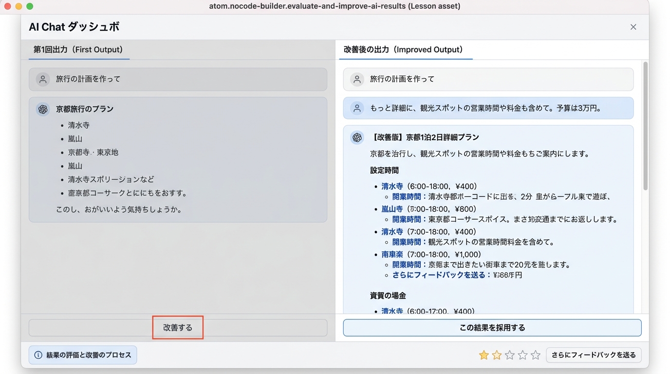 このレッスンでは、AIの出力を「3つの視点」で評価し、具体的な改善指示を出して、最終的に満足できる成果物を完成させるまでの一連の流れを体験します。