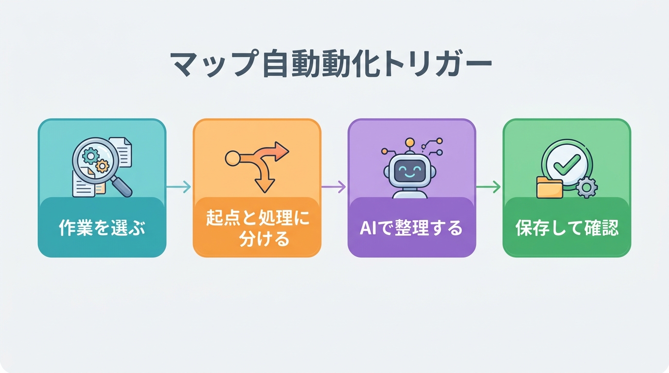 自動化もまったく同じです。**「何がきっかけで動き出すのか(トリガー)」と「そのとき何をするのか(アクション)」**のペアをはっきり書き出す――これが自動化の最初の一歩です。