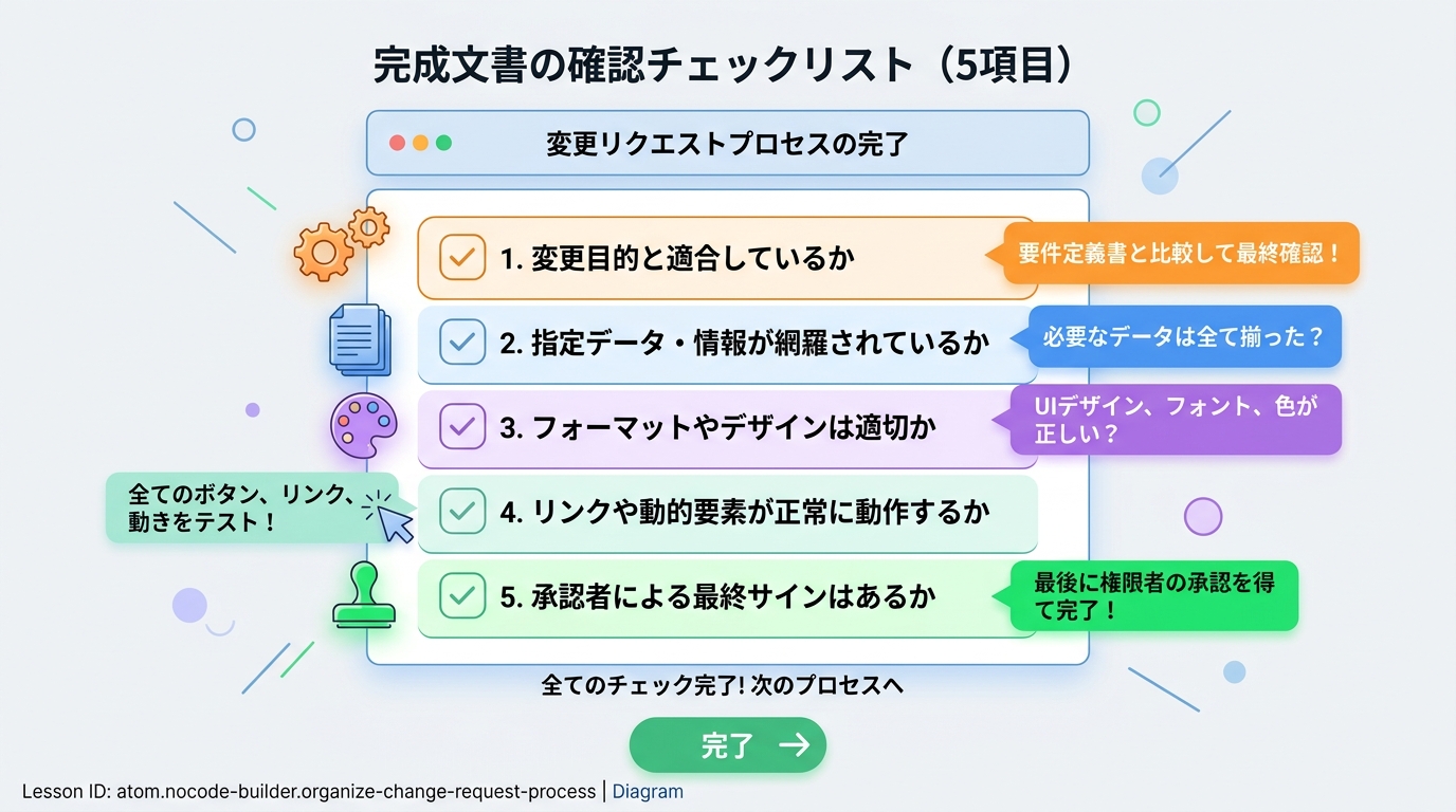 すべてチェックがつけば完成です。文書を社内で共有しやすい場所(Googleドライブ、Notion、社内Wikiなど)に保存しましょう。