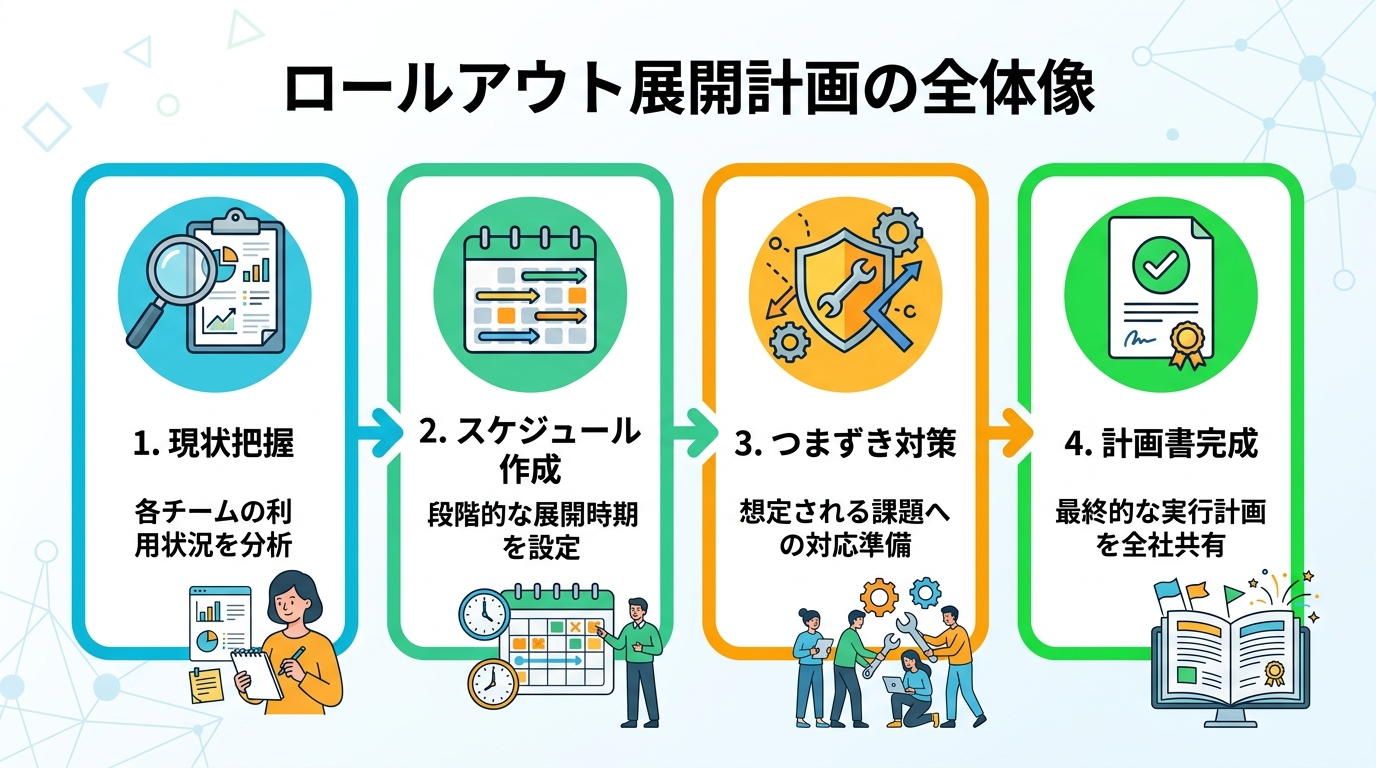 | 展開先を広くしすぎて計画が抽象的になる | まず 1 部署 × 1 ツールに絞る。成功したら横展開する |