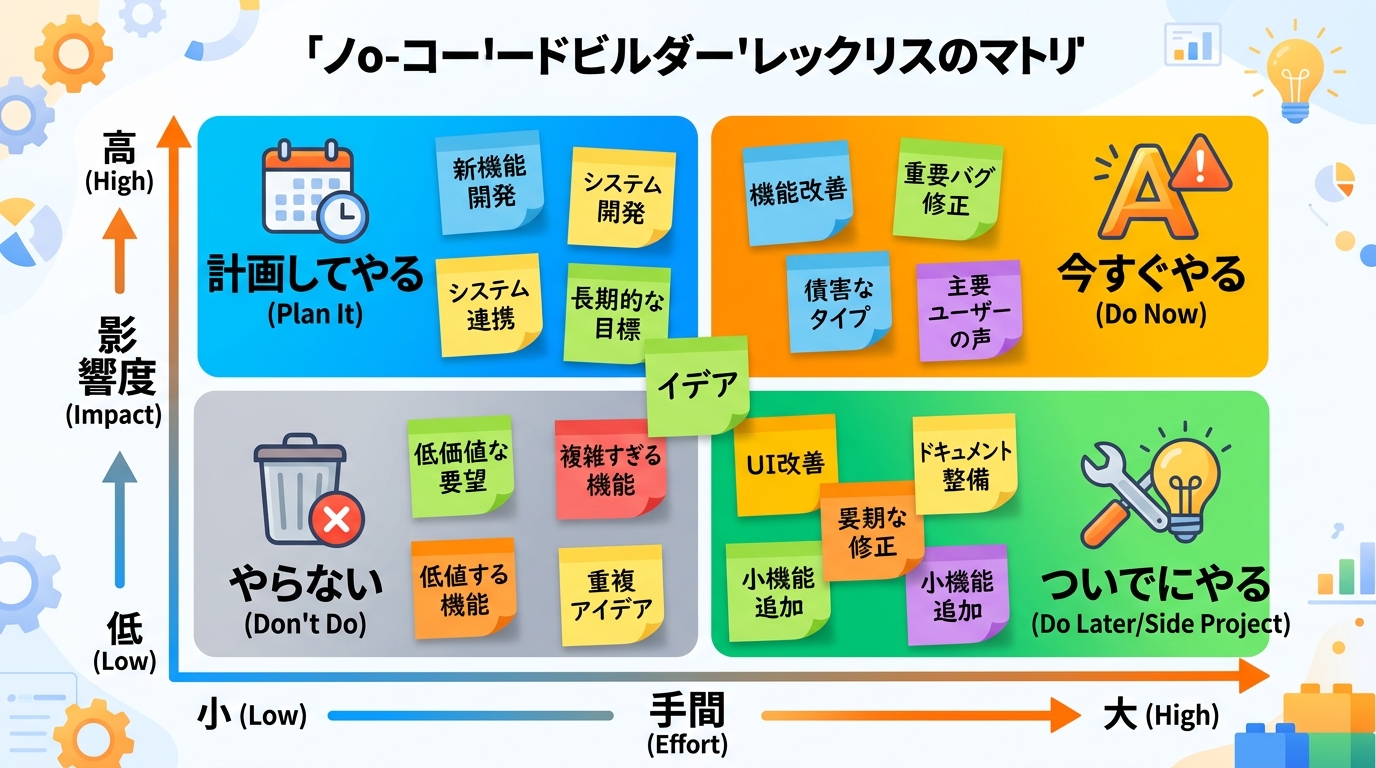 優先課題を整理する 旅行に行くとき、行きたい場所が10個あっても全部は回れませんよね。「時間はかかるけど絶景」「近いけど普通」——そんな候補を比べて、今回はどこに行くか決めるはずです。 アプリやツールづくりも同じで...