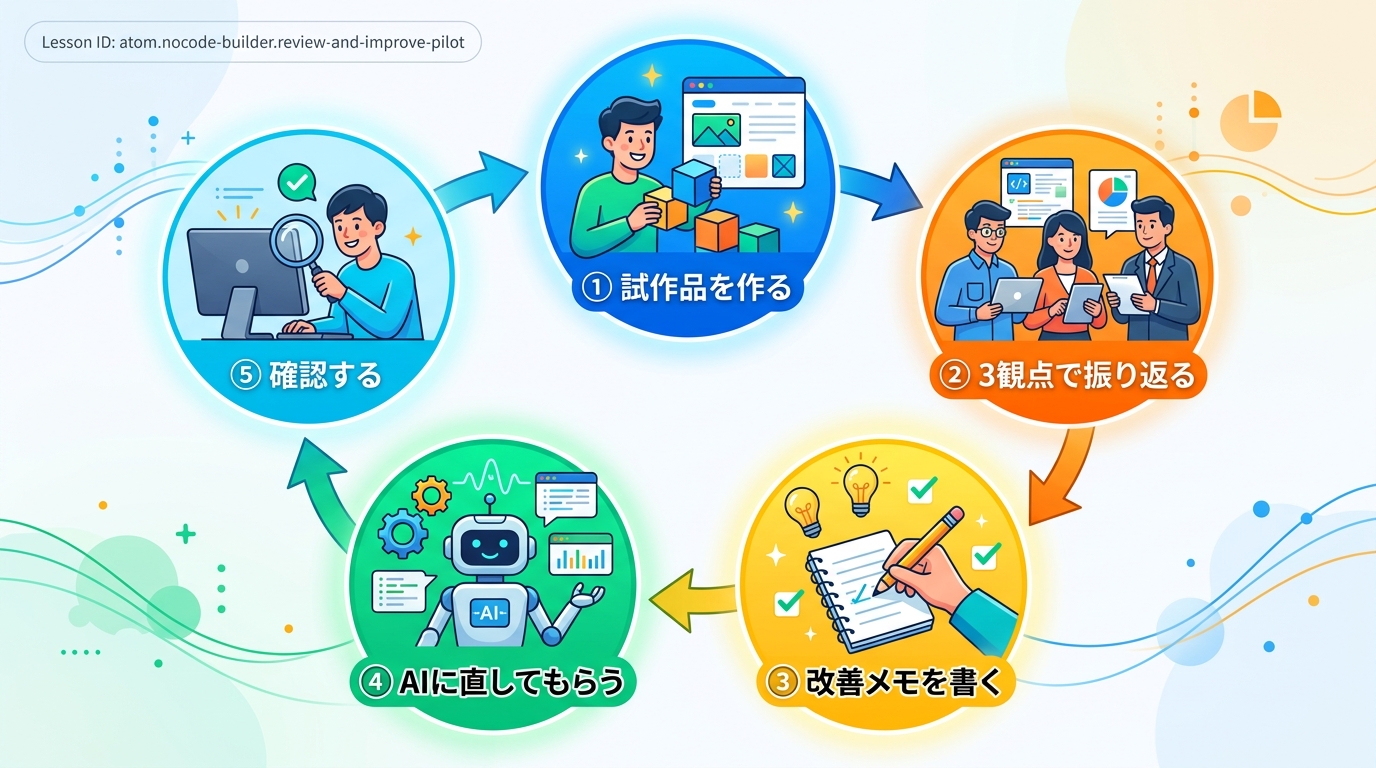 このレッスンでは、あなたがこれまでに作った試作品を3つの観点で振り返り、AIツールの力を借りて改善点を見つけ、実際に1つ直すところまでを15分で体験します。