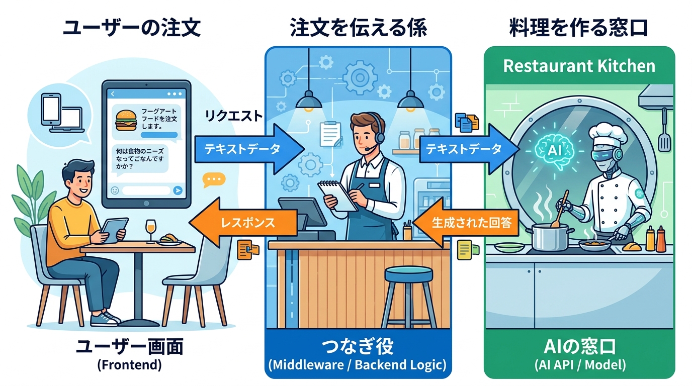 | つなぎ役 | バックエンド / ミドルウェア(=裏側でデータを中継する仕組み) | AIへの問い合わせやデータの加工 |