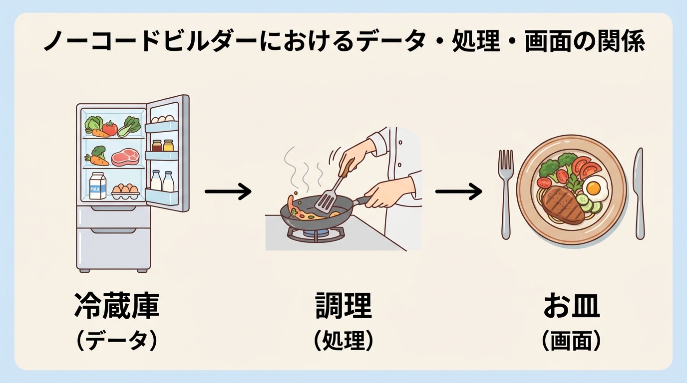 お客さんは「完成した料理(=画面)」しか目にしませんが、裏側には必ず「食材(=データ)」と「調理(=処理)」があります。アプリもまったく同じ構造です。