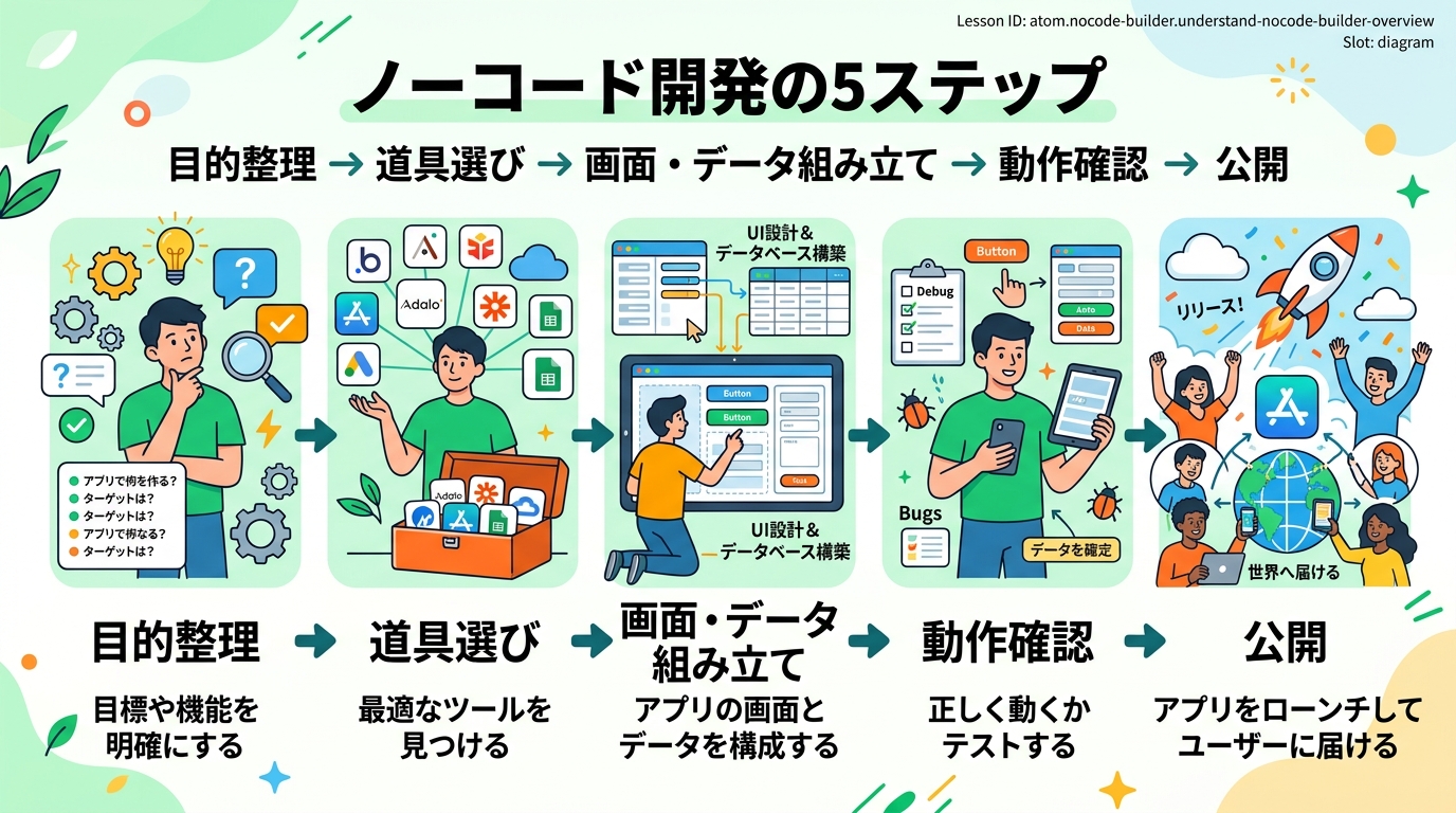 ノーコードでアプリや業務ツールを作る流れは、大きく5つのステップに分かれます。
